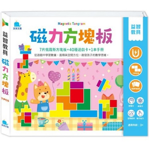 本產品共有7片俄羅斯方塊板和40種遊戲卡片,利用磁力拼貼的方式固定圖形,讓孩子好動手、易操作、得到成就感。每片方塊板由不同數量的正方形組成,孩子必須觀察圖形中的面積、思考如何旋轉與擺放,才能正確拼出圖案。