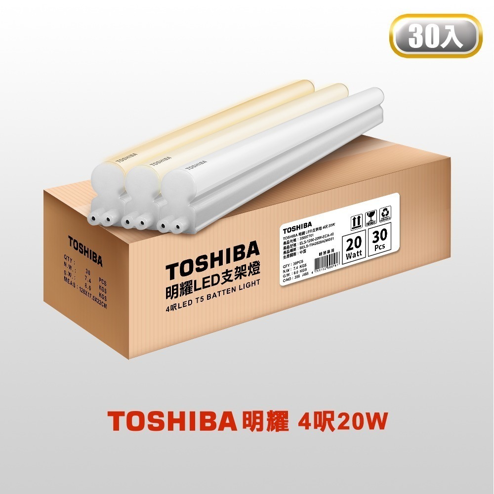 30入組 TOSHIBA東芝 二代 4呎 明耀LED支架燈20W 日本設計 2年保固 白/自然/黃光