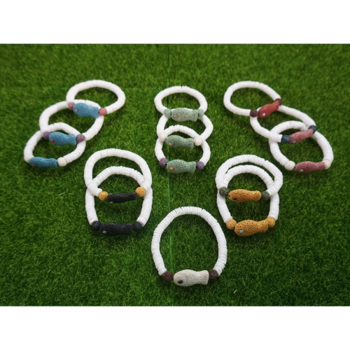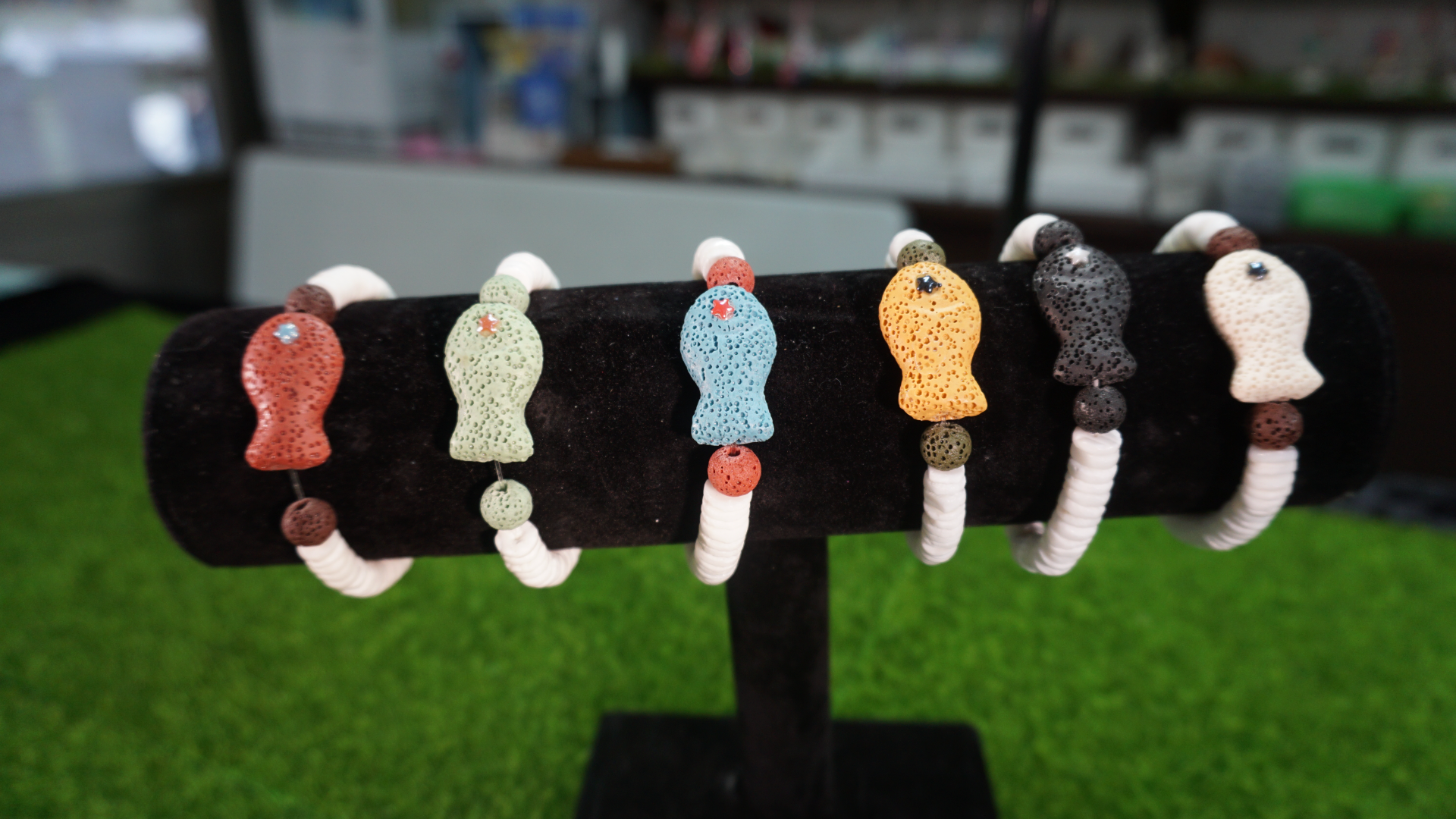 火山石不僅擁有獨特的外觀,其內含的微量元素、礦物質與能量磁場更是不可忽視的珍貴資源。經常佩戴火山石飾品,可以促進細胞新陳代謝,調整體質,提升整體的健康狀況。這款手鍊中的火山石魚兒造型,共有白、藍、綠、棕、褐、黑等多種色系,每一種顏色都代表著不同的能量與祝福,您可以根據喜好進行客製化選擇。