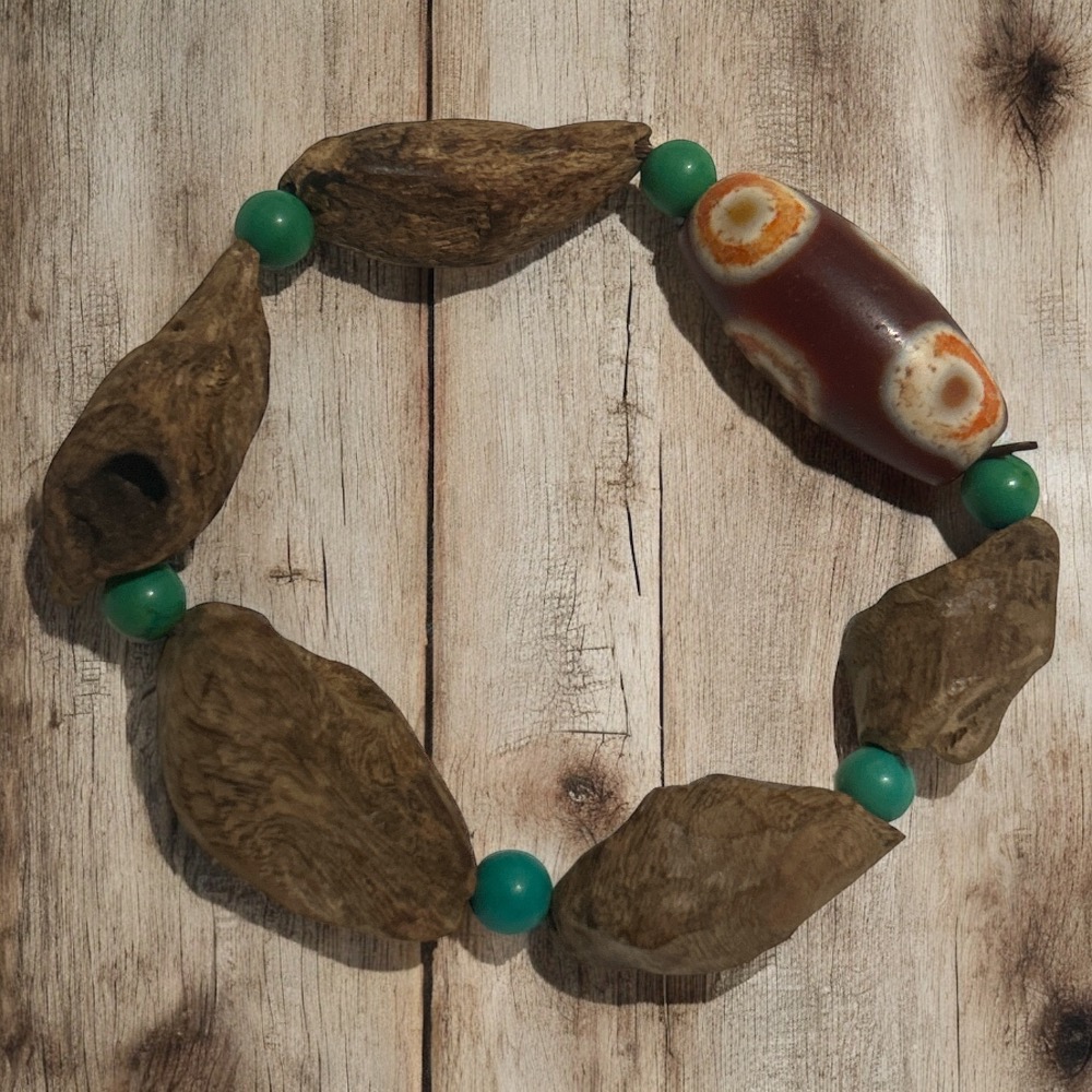 主珠為經典天珠,帶有明顯的天眼圖騰,象徵辟邪化煞、招財納福,是藏傳佛教中的守護聖物,亦富有靈性與祝福之意。搭配綠松石珠點綴其間,整體色彩自然協調,既具質感又富有意涵。