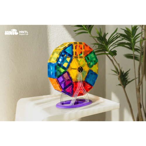 摩天輪特別組合,附支架與轉軸,第一次接觸磁力片與開放式玩法的新手,也能輕易地完成作品喔!組合內有少見的六角形及鏤空芒星造型磁力片,除了摩天輪造型,也試著玩出不同變化吧。