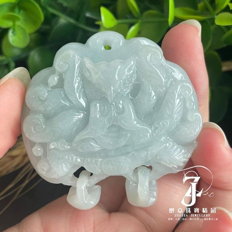 翡翠 帶證 緬甸玉 厚裝修道狐 九尾 果綠 項鍊 如意鎖 如意 玉牌 玉墜 玉件 玉戒 九尾狐仙 狐 保A 直播