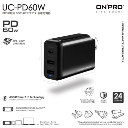 .Input/輸入:100~240V國際通用 .Ouput輸出:Single Type-C:5V/3A(正常充電模式) .Single Type-C:9V/3A , 12V/3A , 15V/3A , 20V/3A 60W(Max)(快速充電模式) .All Port Type-C:5V/3A(正常充電模式) .All Port Type-C:9V/3A , 12V/3A , 15V/3A , 20V/2.25A 45W(Max)(快速充電模式) .USB1-2:5V/2.1A 10.5W(正常充電模式) .保護性:過熱保護、過充保護、過放保護、過電流保護、過電壓保護、短路保護 .內容物:充電器/UK AU EU轉接器/收納袋 .Dimension/體積:L57xW85.6XH30mm .Weight/重量:162g(本體)
