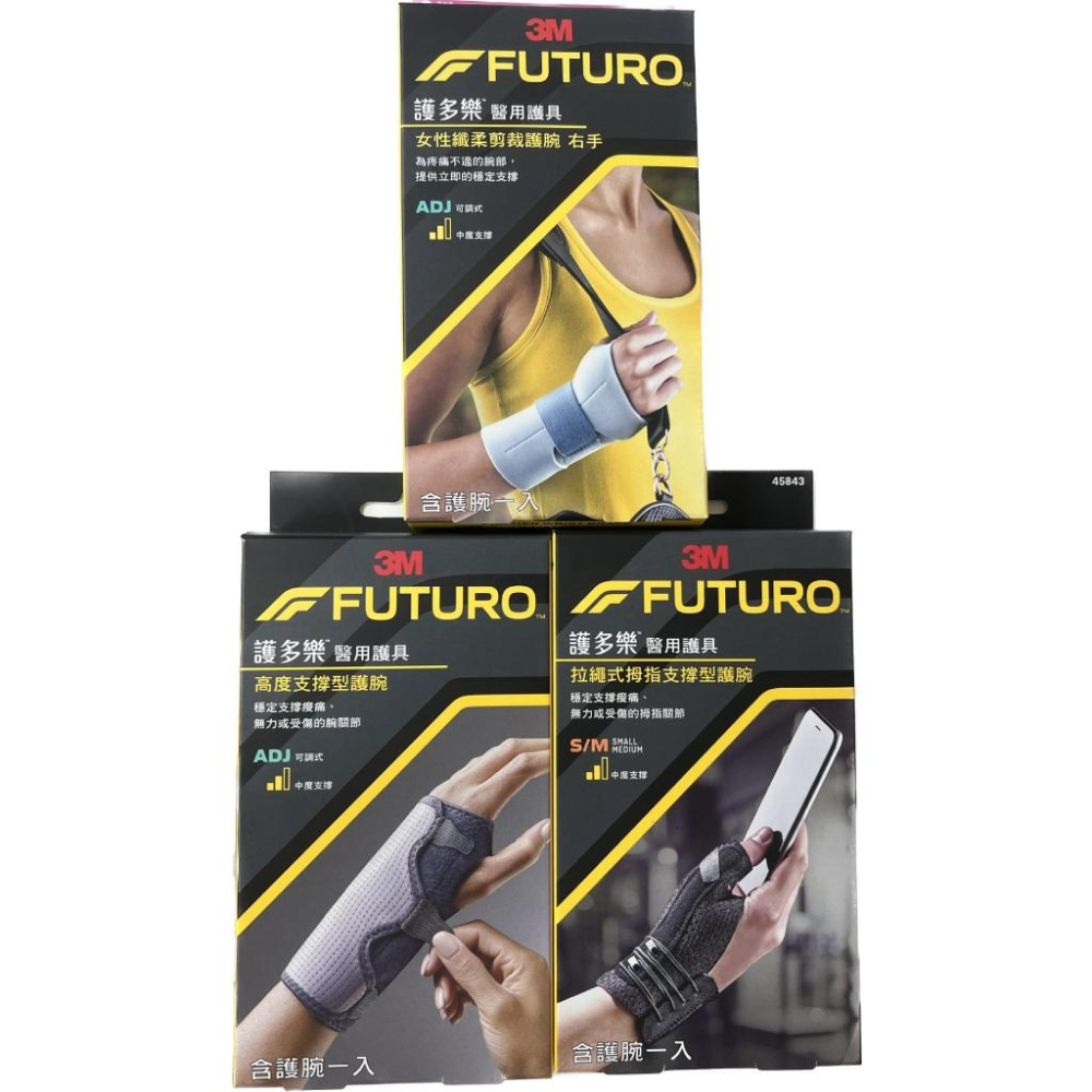 【商品詳情】 商品名稱:3M 護多樂 女性纖柔剪裁護腕 (左/右手) 一入 尺寸:可調式 ---------------------------------------------------------------------------------------------------------------------------- 商品名稱:3M 護多樂 高度支撐型護腕 一入 尺寸:可調式 ---------------------------------------------------------------------------------------------------------------------------- 商品名稱:3M 護多樂 拉繩式拇指支撐型護腕 一入 尺寸:S/M 醫療器材許可證所載品名:3M 護多樂醫用護具 (未滅菌) 醫療器材許可證所載核准字號:衛部醫器輸壹字第016810號 醫療器材許可證所載藥商名稱:1407001100 台灣明尼蘇達礦業製造股份有限公司 製造廠名稱:MMX0010100 3M EDUMEX S.A. DE C.V. 製造廠地址:6620 ORIENTE, CALLE RAMON RIVERA LARA, CD. JUAREZ, CHIHUAHUA, MEXICO 32605, MEXICO 【販售藥商藥局資訊】 藥商許可執照:北市衛藥局(松)字第5901013862號 藥商公司名稱:禾宜藥局 藥商地址:台北市松山區八德路三段12巷51弄16號 藥商電話:02-2578-0236 【訂購須知】 ✔️週一至週日17點結單 ✔️商品有現貨:24小時內會出貨 ✔️商品無現貨:備貨日約3-7天,不包含例假日 ✔️急需可前來門市購買,門市營業時間為週一至週日9:00-22:00 ✔️為保護顧客權益,收到商品請全程錄影拆封 ✔️退換商品必須是全新狀態(商品包裝、內容物皆完整),否則恕不接受退換貨 ✔️因超商限重五公斤,若需大量訂購請選宅配或透過「聊聊」詢問 ✔️商品與實體門市同步販售,庫存可能有落差,下單前可先詢問是否有現貨