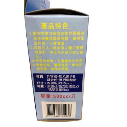【大量購買可議價】 瞬間凝固不外漏,品質保證台灣製造,吸尿性特強,可連續多次使用。 不能下車或不便下車時,不管是大人、小孩、男女老少通通適用。 商品名稱: 車上用尿袋 內 容 量: 尿袋x3 強力吸收包x3 透明丟棄袋x3 內容物成份: 外容器:聚乙烯PE 吸收粉:聚丙烯酸鈉 注意事項 避免阻塞,請勿直接丟於馬桶內。 消費者使用前應詳閱產品說明。 請置於陰涼乾燥及兒童不易取得處,避免高溫及陽光直射。 【販售藥商藥局資訊】 藥商許可執照:北市衛藥局(松)字第5901013862號 藥商公司名稱:禾宜藥局 藥商地址:台北市松山區八德路三段12巷51弄16號 藥商電話:02-2578-0236
