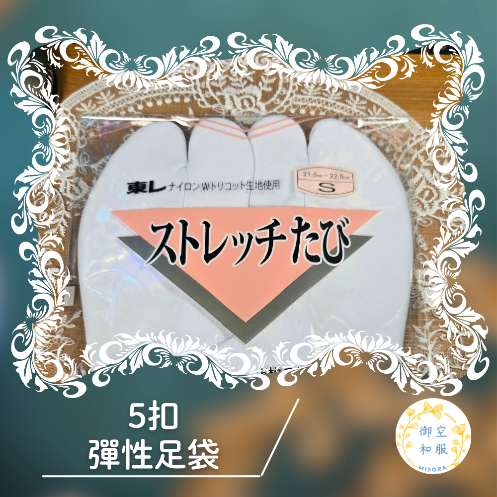 五扣足袋與四扣足袋差別是在襪子筒高,五扣會多一扣的長度,所以筒高較高比較不容易露出皮膚。穿著和服時擔心腳踝露出來,可以穿著五扣足袋,內心也會感覺安全🫶