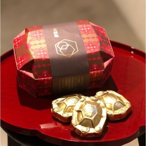 李亭香的經典商品平安龜再進化,將滾沸的麥芽糖倒入上等花生研磨粉拌和,包入香氣四溢的牛奶餡;再以極薄的壓紋金箔紙包覆,透過師傅巧手,細細用餅模壓製而成。由於金箔紙薄如蟬翼,因而需抱著虔敬戒慎之意方能完成,如此也更能傳達送禮者或敬拜神明的虔誠謝意;金錢龜也有金錢歸來求財運的祈福寓意。