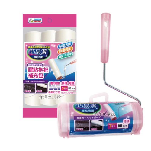 【產品特色】 針對灰塵、毛髮及較大顆粒粘著力比同級產品更強,靜電原理吸著髒物,使用後不會留殘膠;使用後可直立放置或吊掛收納不佔空間,家中寵物掉毛、難掃灰塵頭髮、打碎的玻璃碎片、床舖棉放地毯、窗簾沙發等清潔、車內灰塵..等,皆可輕輕鬆鬆清潔,膠紙整卷用完可購買補充包經濟又環保。 【產品規格】 品名:巧易潔滾筒式膠黏拖把(短柄) 數量:1組入(已附一枚膠紙) 長度:握柄30cm 品名:巧易潔滾筒式長短柄膠粘拖把補充包 數量:1包3枚入 規格:60週(160mmxΦ38mm) 保存期限:5年 材質:單面膠紙 產地:中國CHINA 【注意事項】 要使用於光滑表面時(如瓷磚、木質地板)請先於地毯或布,沙發來回滾動數次以降低粘度。 請勿使用於潮濕物體。 請遠離火源與孩童易取得處,以避免危險。 請存放於乾躁陰涼處,且避免陽光直射本產品。 請勿將本商品使用於非本商品原本設定之用途。