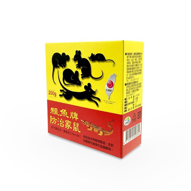 鱷魚牌擒鼠皇 環署衛製字第1513號 商品代碼PM20 容量:200g 主要成份:雙滅鼠 防治對象:鼠 適用範圍:公私場所之室內外環境等家鼠出沒處 使用方法 1. 放置於老鼠出沒、棲息處附近。 2. 若有老鼠取食時,將此取食處建立為毒餌站,可酌予增加毒餌直到沒有老鼠活動的跡象存在時止。