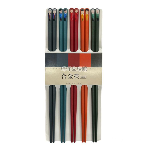 名稱:合金筷 材質:高份子材料、玻璃纖維 數量:5雙(為圖片上的那五雙不可挑一樣的😓) 產地:中國 👉不發霉、耐高溫120度、防滑設計~ 使用方法: 拆包後用清水加洗滌劑浸泡15分鐘,洗淨後即可使用。 注意事項: 禁止油炸,燒烤、煎焗、明火等環境下使用;不宜使用鋼絲球等硬物摩擦清洗。