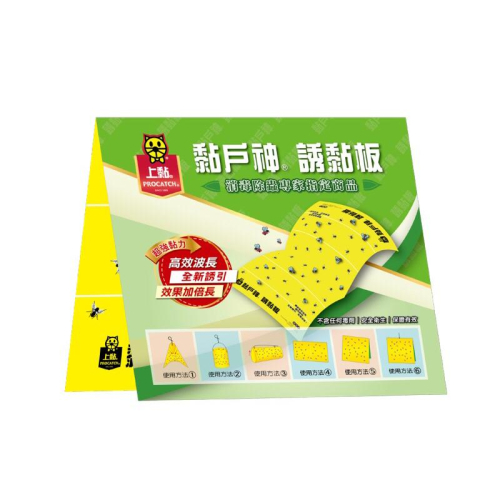 上黏黏蠅板(黏戶神) 規格尺寸 尺寸:45*24.5CM 材質:白銅卡紙 主要成份:合成樹脂、合成橡膠 包裝:每包5張    注意事項 1.上黏黏戶神板黏性超強,能耐溫不易變質適用於室外,任何場所請安心使用。 2.上黏黏戶神板採用無毒無臭的超黏力黏膠。 3.上黏黏戶神板兩面沾滿90%以上之蒼蠅、害蟲之後便可丟入垃圾桶,方便又衛生。 4.本公司產品如有沾黏到物品或手時,請以抹布沾去漬油擦拭,再以肥皂清洗即可。 5.勿將黏蠅板放置於風沙灰塵繁多之處,和空氣潮濕的場所,以防止黏膠減低黏性。 6.因黏蠅板十分具有黏性,故在折疊成形之後放置於小孩、寵物不易觸碰到的地方。 7.本產品如有滲油情形,純屬正常,請安心使用。