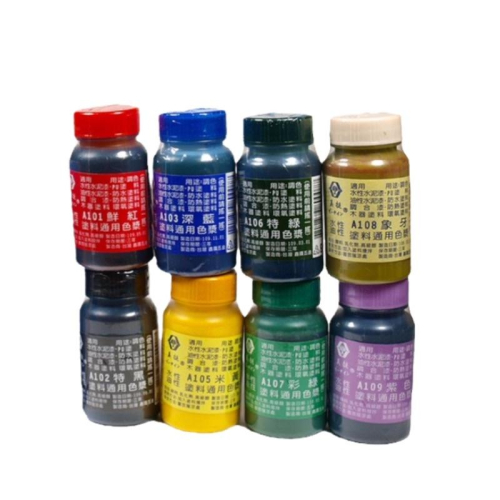 【名稱】美挺色母 【成分】顏料 乳化劑 高級醇 【適用】水性水泥漆、油性水泥漆、調合漆、環氧樹脂、木漆塗料、優麗漆。水性油性通用 【顏色】 A101鮮紅 A102特黑 A103深藍 A105米黃 A106特綠 A107彩綠 A108象牙 A109紫色 A111棕紅 【容量】50cc