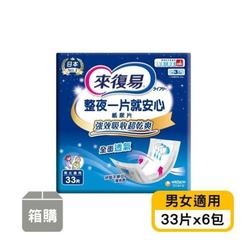 【來復易】整夜一片就安心紙尿片(33片x6包)