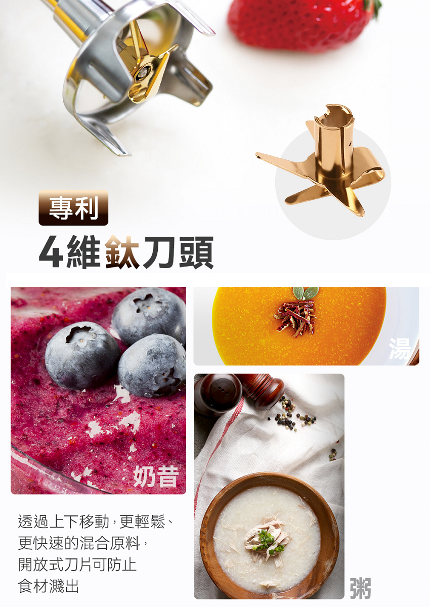 刀頭用法:1.十字立體鍍鈦刀頭(果泥、米穀漿、嬰兒副食品、冰沙、濃湯、果汁)