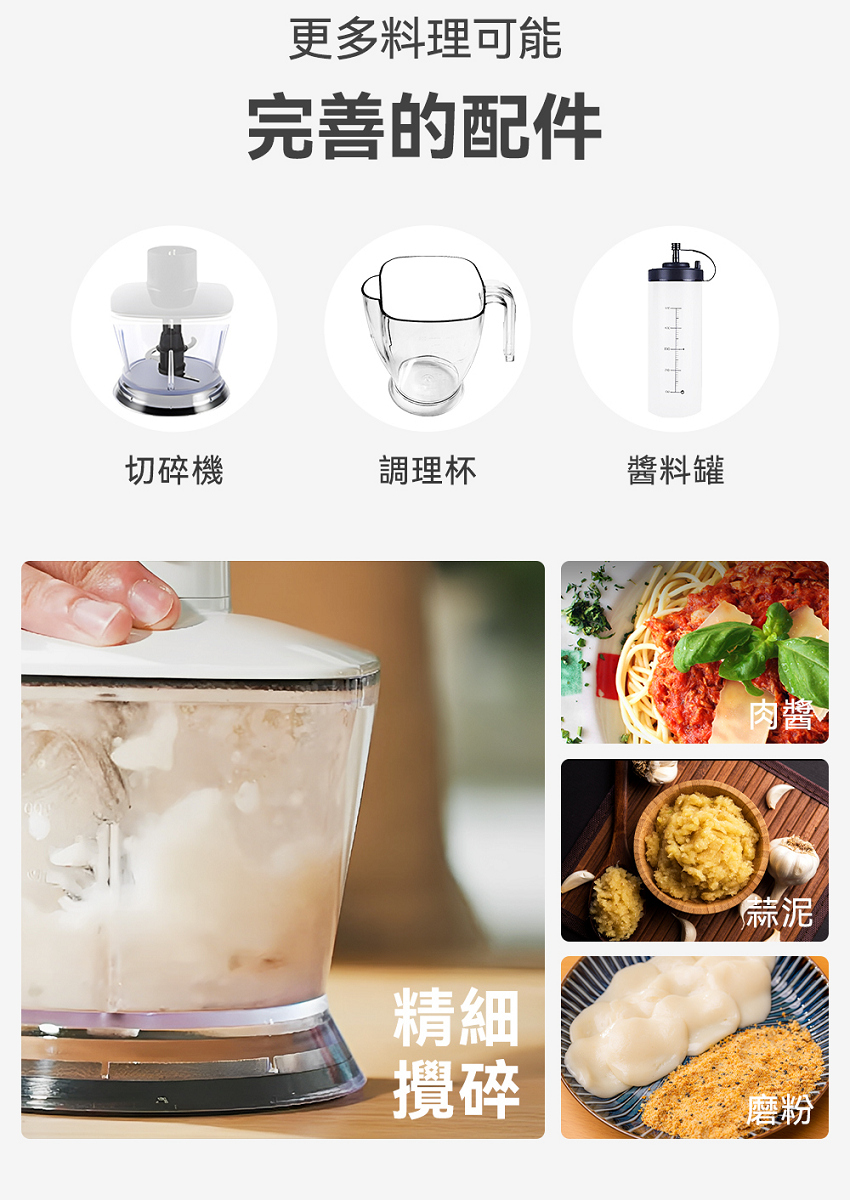 內容物:主機放置架×1、900cc料理杯×1、醬料罐x1、升級版多用途研磨粉碎器(含刀具)×1