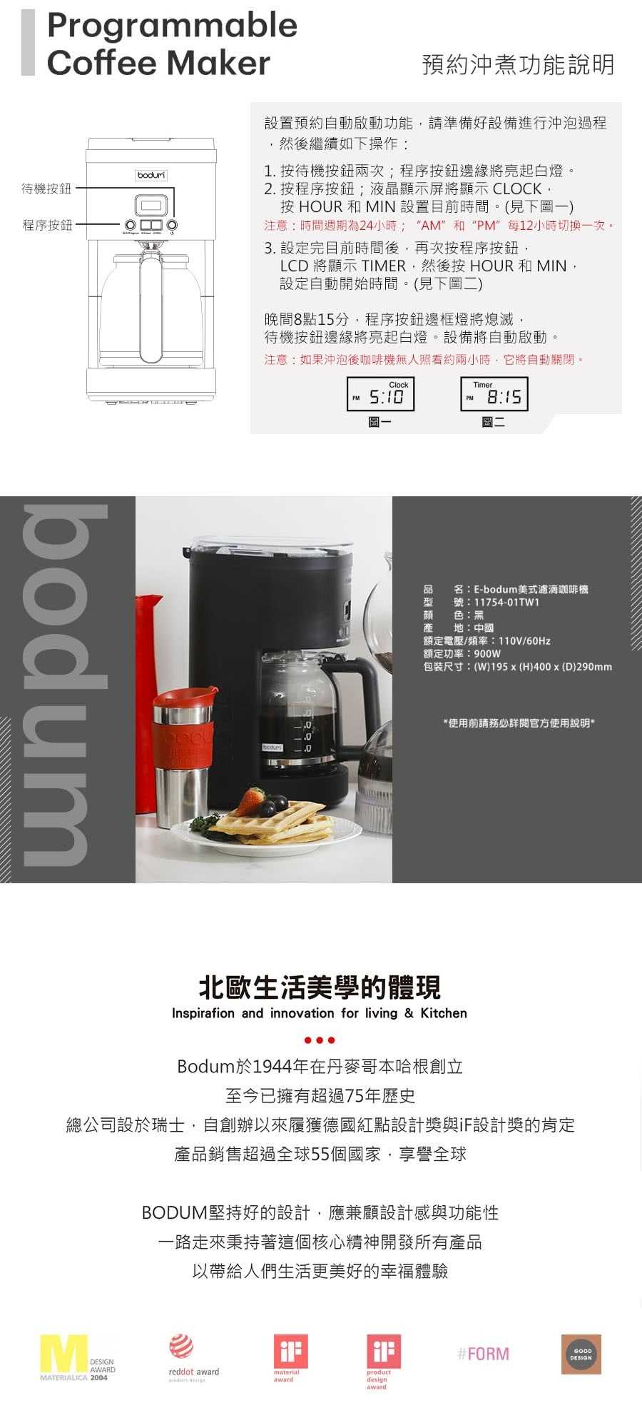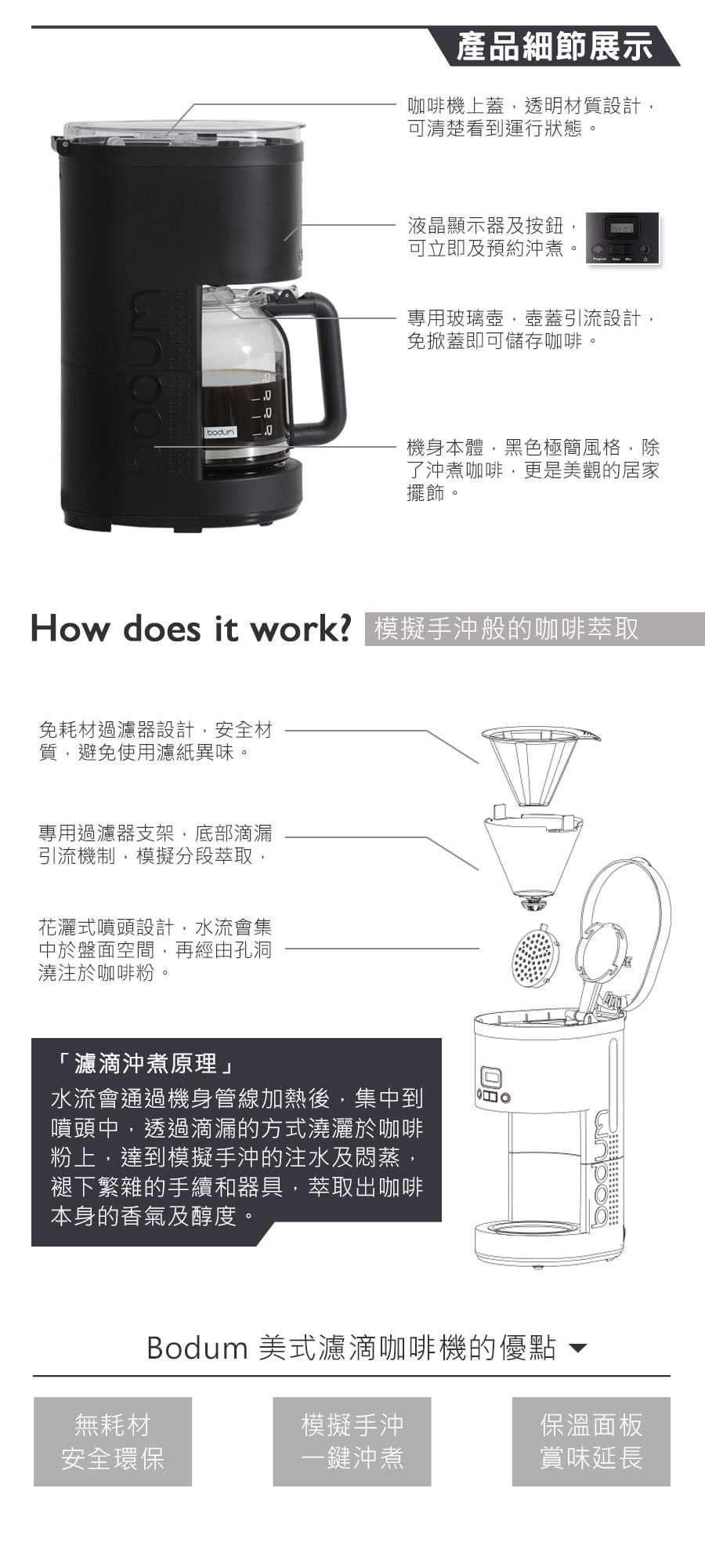 Bodum 美式濾滴咖啡機 11754-01TW1 花灑噴頭設計 可24小時預約沖煮