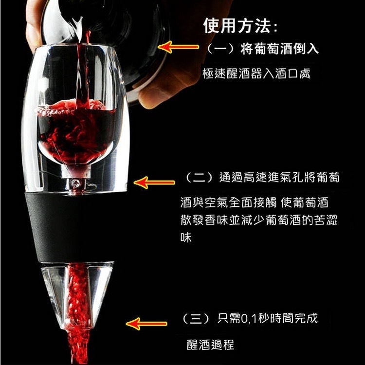 使用方式:將紅酒瓶口對著醒酒器倒入,緩緩倒出紅酒即可醒酒
