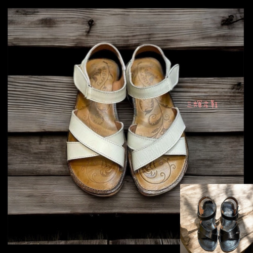 台灣製全真皮 牛皮超防滑生膠底鞋底縫線 老師傅手工縫製 素色交叉寬楦文青簡約魔鬼氈平底涼鞋