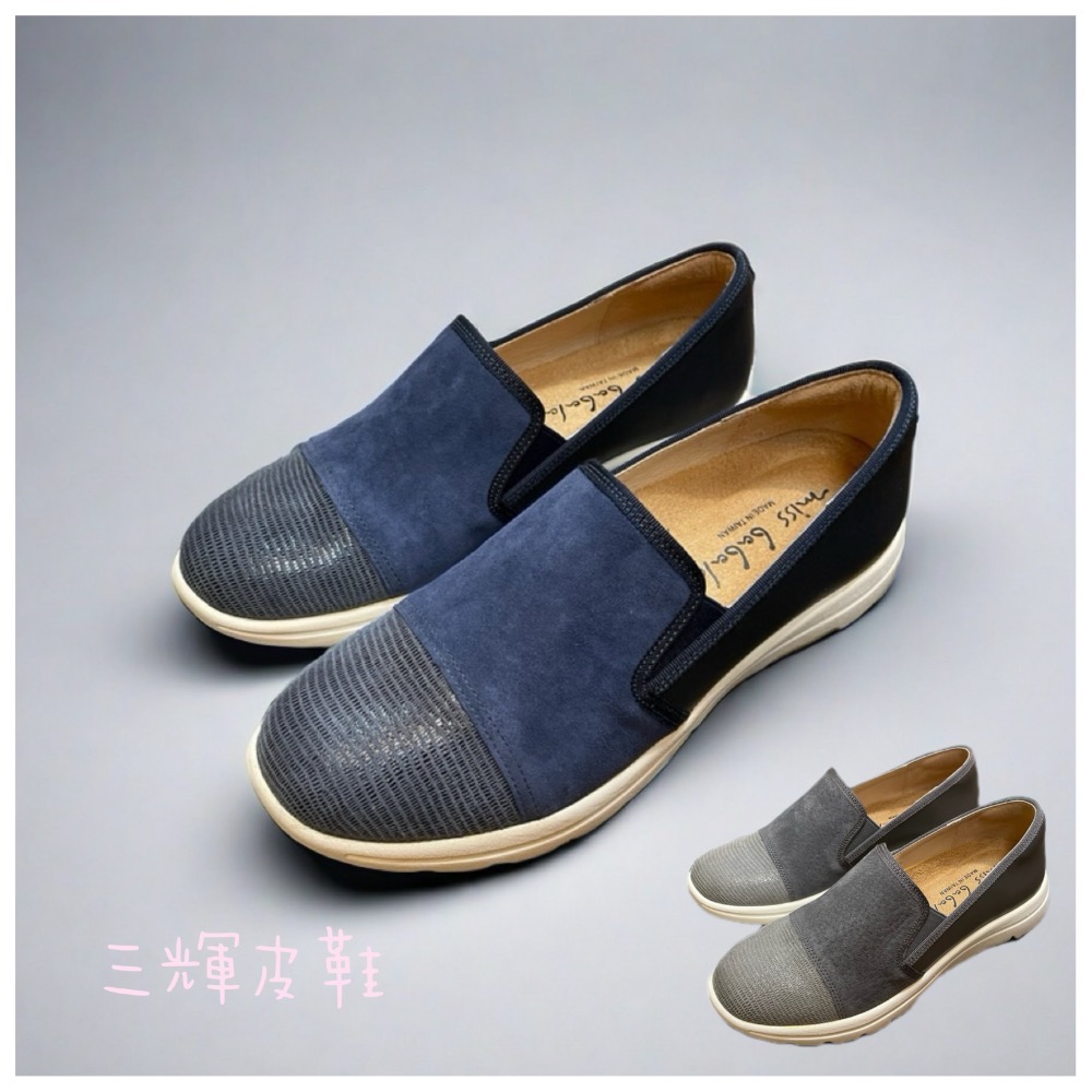 台灣製Miss babala全真皮 牛皮超輕量 異材質拼接懶人平底休閒鞋 藍/灰零碼特價現貨MIT