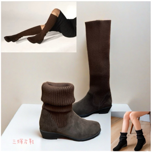 牛皮麂皮針織毛線多用途楔型長靴 萬用百搭圓頭波跟平底短靴中筒靴 2WAY彈力襪低跟反折靴 現貨加預購