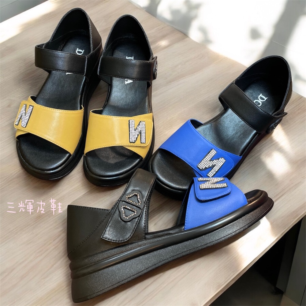 韓國專櫃商品全真皮 牛皮魔鬼氈可調整水鑽字母雙寬帶平底涼鞋