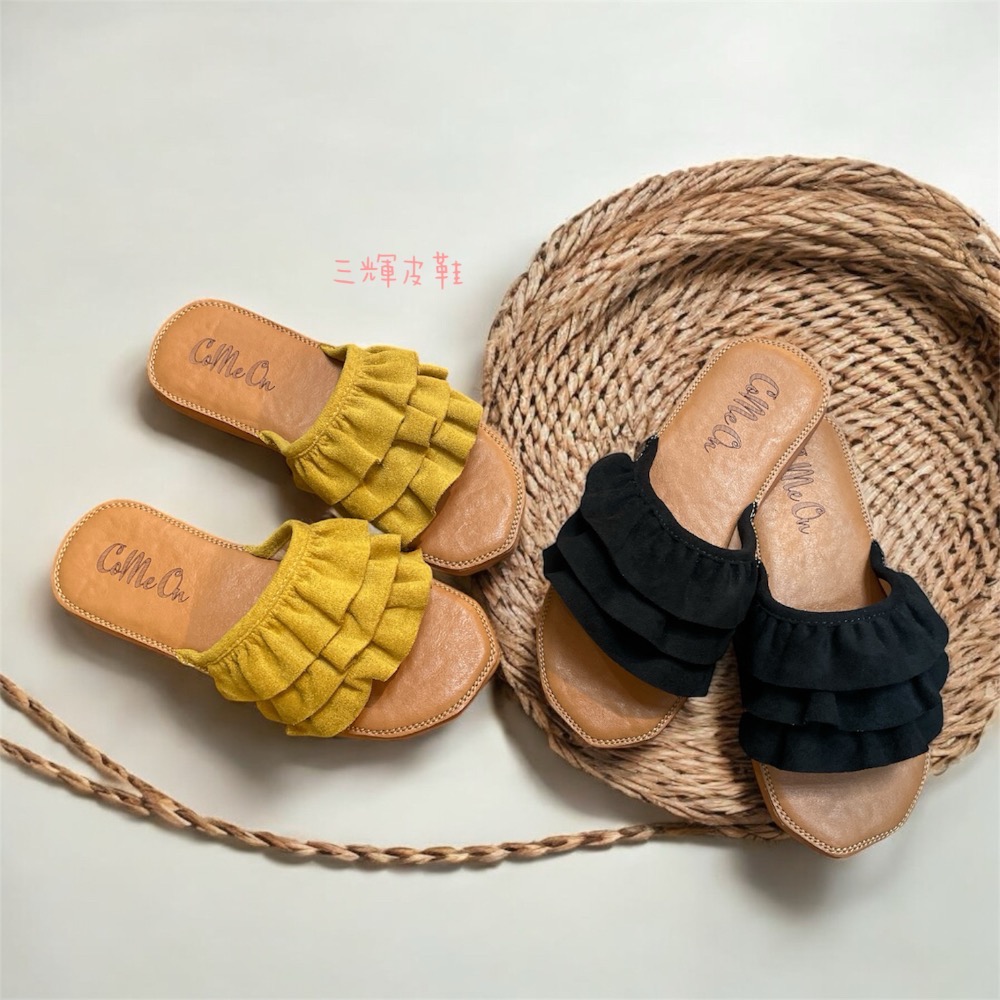 牛皮荷葉邊Q彈軟底平底拖鞋