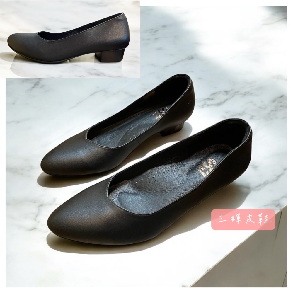 台灣製全真皮 羊皮素面V口尖頭基本款低跟鞋 木頭跟粗跟包鞋