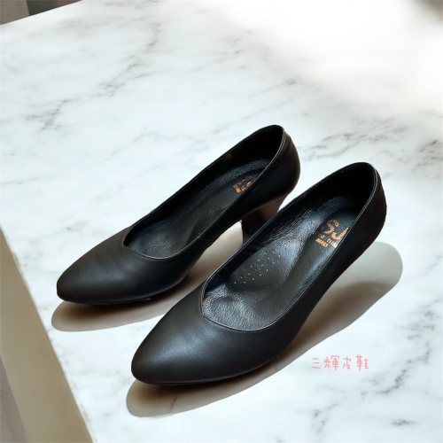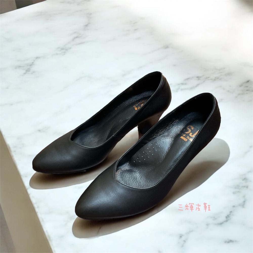 台灣製全真皮 羊皮素面V口尖頭基本款中跟鞋 木頭跟粗跟高跟鞋