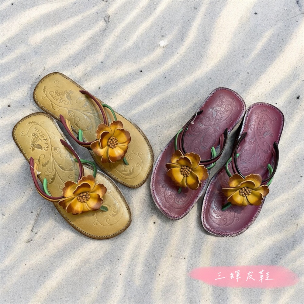 台灣製全真皮 牛皮立體雕花文創手工細帶夾腳平底拖鞋 MIT手作鞋