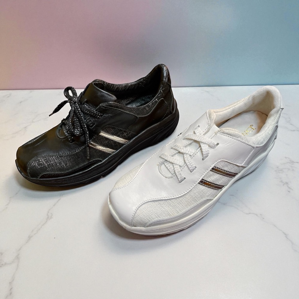 台灣製全真皮 MIT 牛皮銀色雙線小香風斜紋軟呢綁帶女運動鞋
