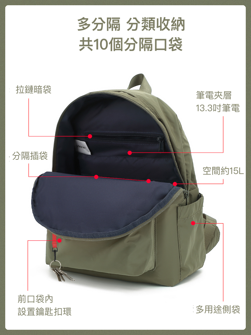 ✓背包內部多分隔,空間大,容量15L. 可放13.3吋筆電夾層, 可放A4資料夾