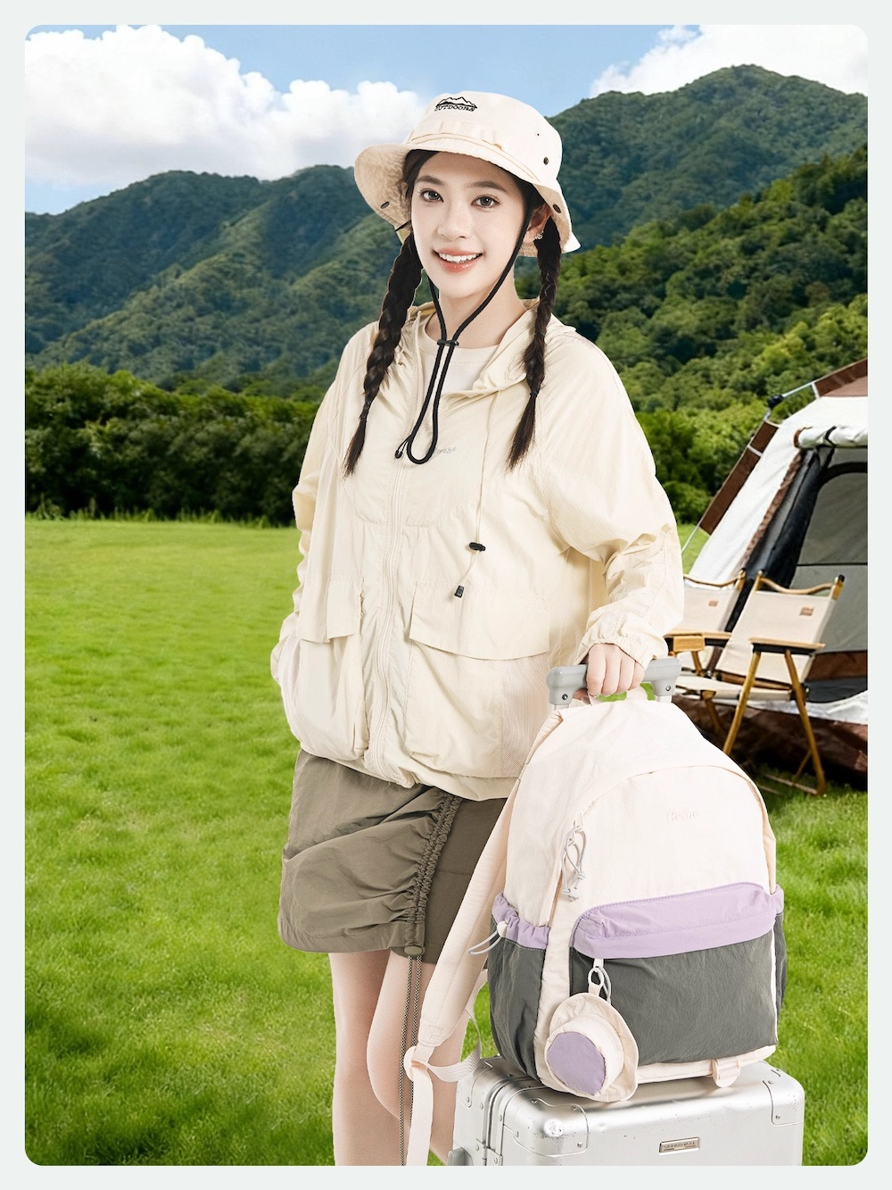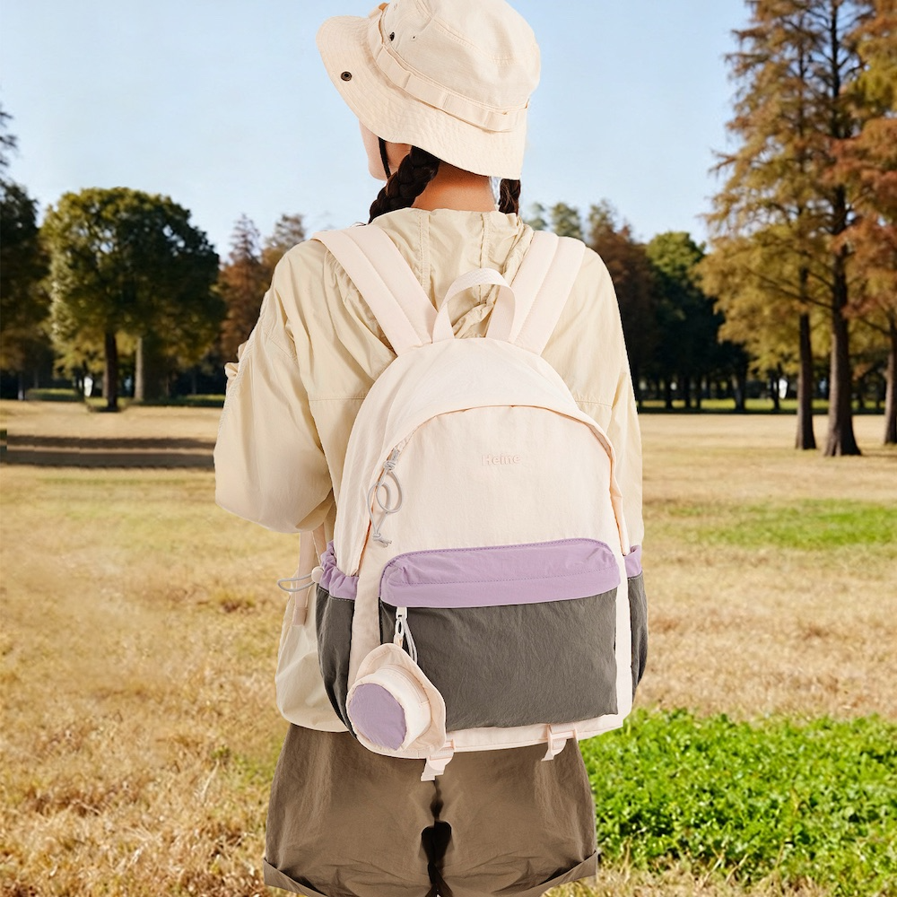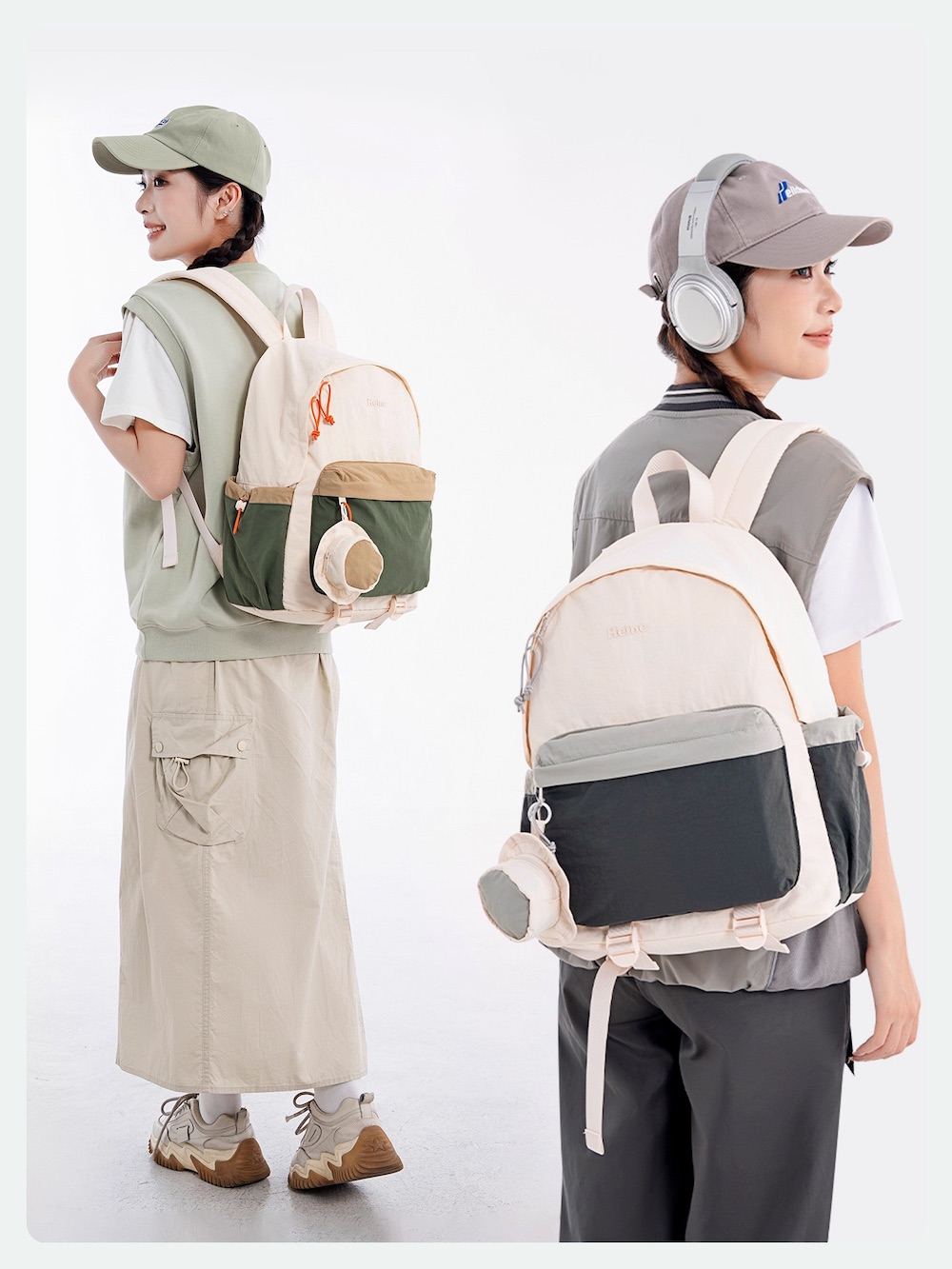 獨特的拼接色塊設計與搶眼的亮橘色拉繩,融合日系復古與戶外風尚。附贈專屬圓形掛飾,打造個人的潮流風格。
