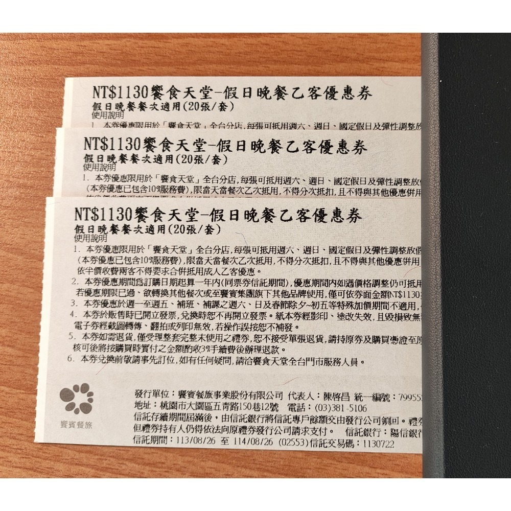 1. 本券優惠限用於「饗食天堂」全台分店,每張可抵用週六、週日、特殊節日、國定假日及彈性調整放假日之成人晚餐乙客餐費,限當天當餐次乙次抵用,不得分次抵扣。(本券優惠已包含10%服務費)