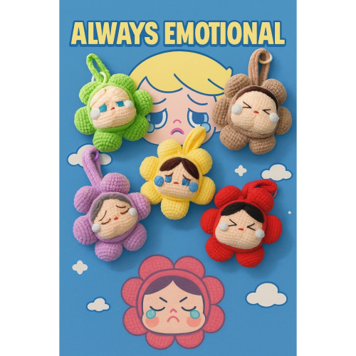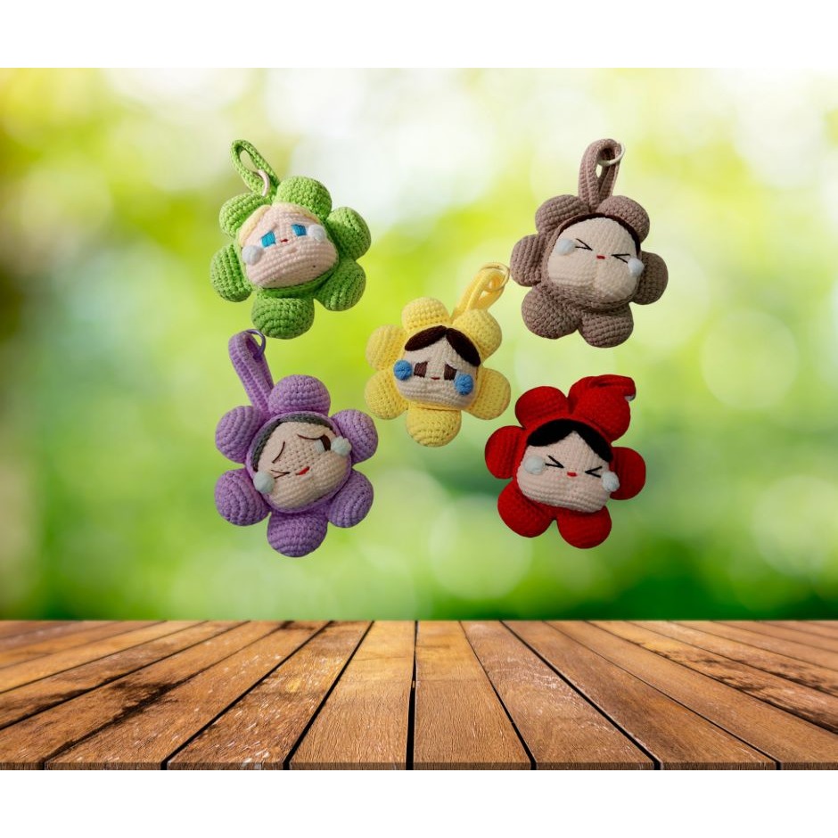 這款手工編織哭娃花朵鑰匙圈,將療癒哭臉表情與花朵造型結合,