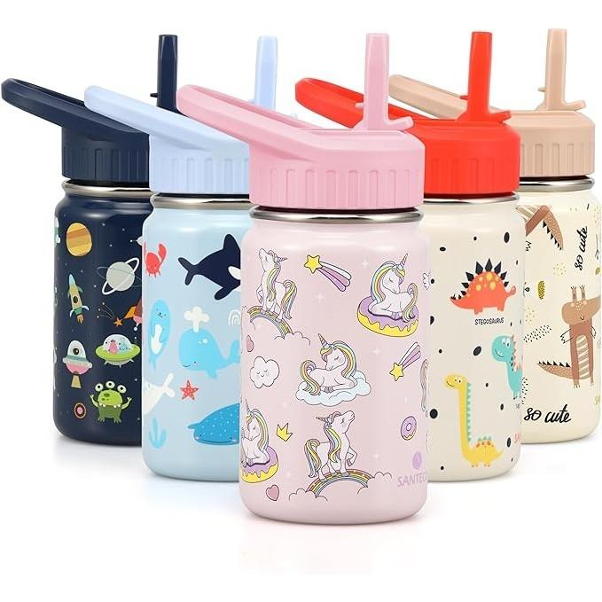 SANTECO 兒童水瓶 附吸管蓋 (約 350.2 毫升)不鏽鋼保溫水瓶 兒童防漏 可愛動物幼兒吸管杯