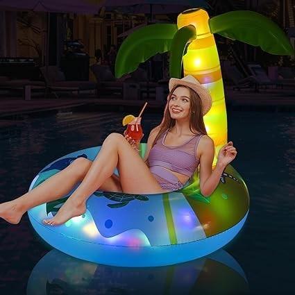 充氣棕櫚樹泳池浮球 附彩色燈 太陽能泳池浮球 約 43 公分游泳管環 沙灘泳池管 夏季泳池筏躺椅