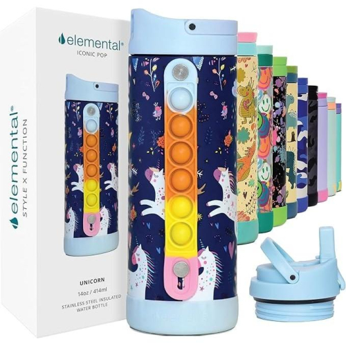Iconic 兒童水瓶 附吸管蓋 & 緩解壓力 Pop It 手把 (約 396.9 毫升) - 獨角獸