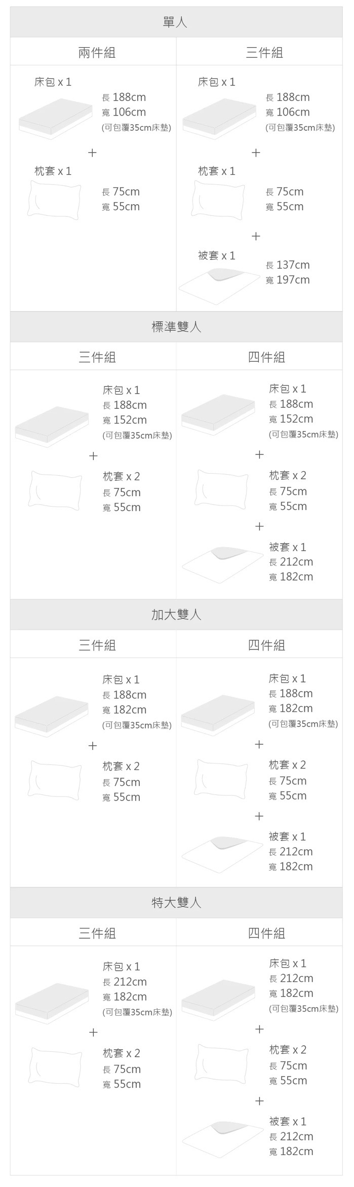 ㄧ組=枕頭套2入+床包1入+鋪棉兩用被單