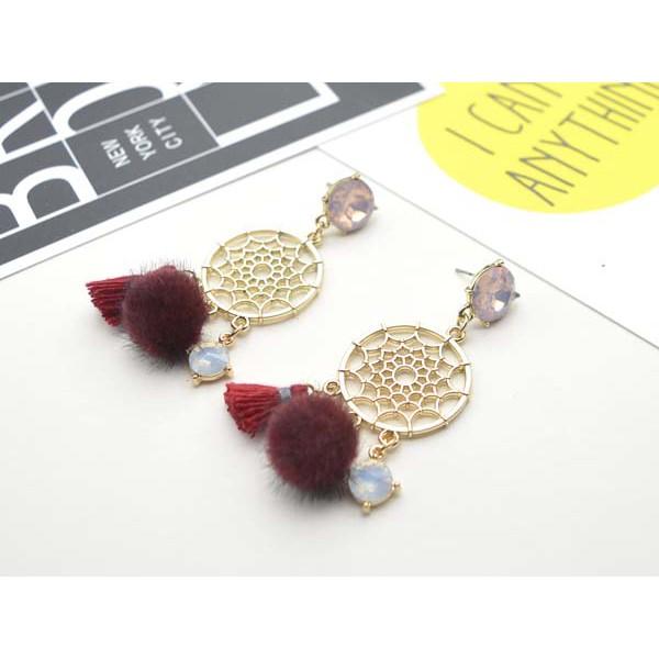 韓國 捕夢網造型 毛球 垂墜式 耳針 耳環
