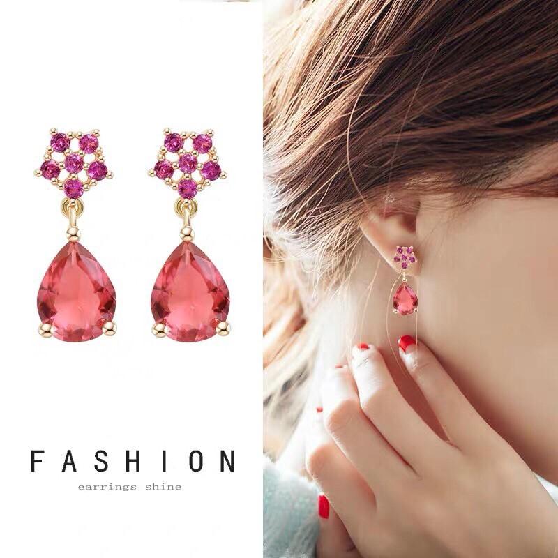 韓 氣質 莓紅 寶石 鋯石 水滴 造型 垂墜式 s925抗敏感 耳針 耳環(可改耳夾)