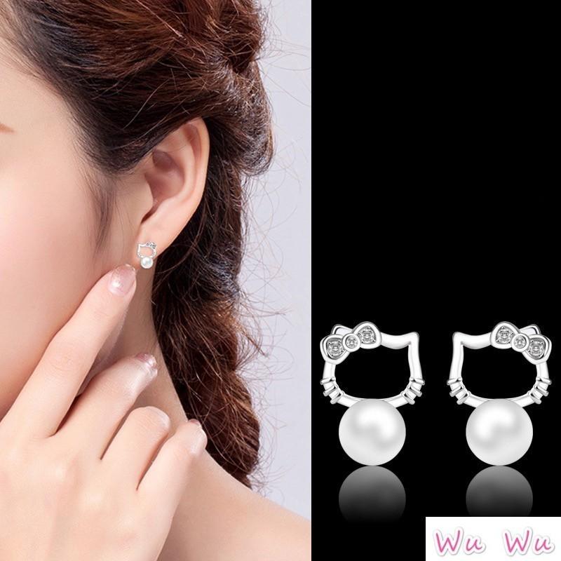 韓 氣質 輕巧 貓咪 kitty 造型 珍珠 s925抗敏感 耳針 耳環(可改耳夾)