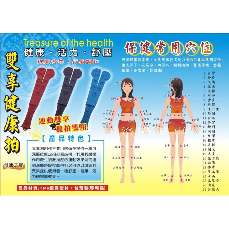 雙享健康拍 商品材質:TPR環保塑材 長度:35公分 寬度:10.5公分 重量:200公克 顏色:紅、藍、紫色 本專利創作主要目的係在提供一種可槌敲. 拍打深層按摩之拍打器結構, 利用其緩衝作用產生複數推壓的連動效果進而達到 深層舒壓按摩拍打之目地以增進其效果提供使用者 一種舒適、健康、活力的完美效果。