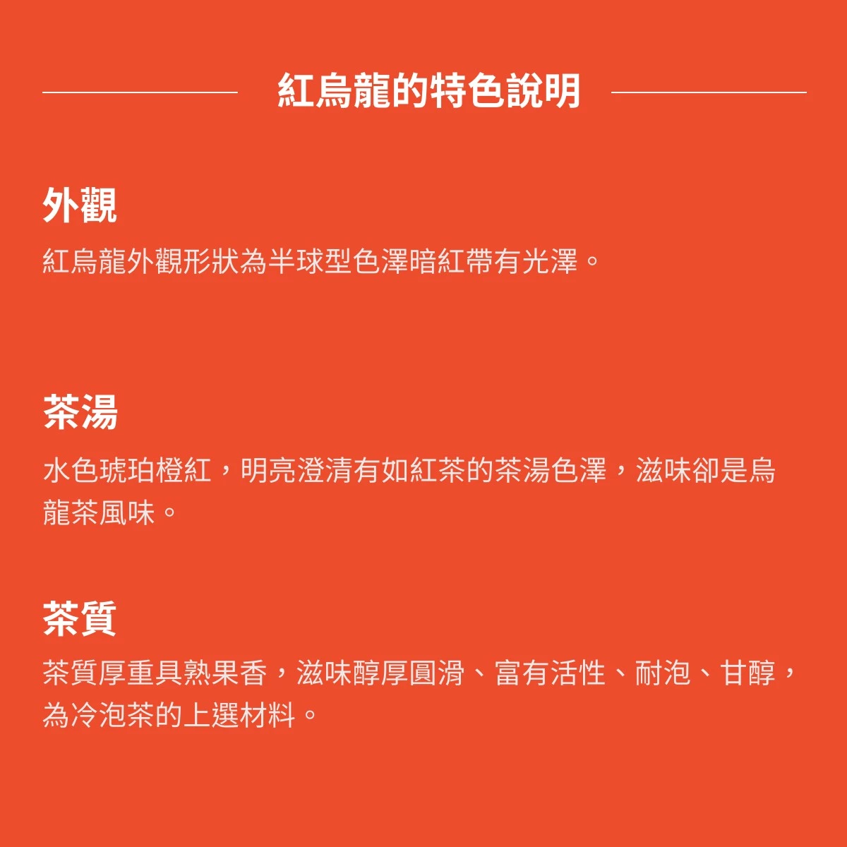 ※紅烏龍屬於發酵程度重,強調的是茶湯滋味的甘醇與水色,可帶有輕熟香。長久存放較不易變質,可當陳年茶典藏。