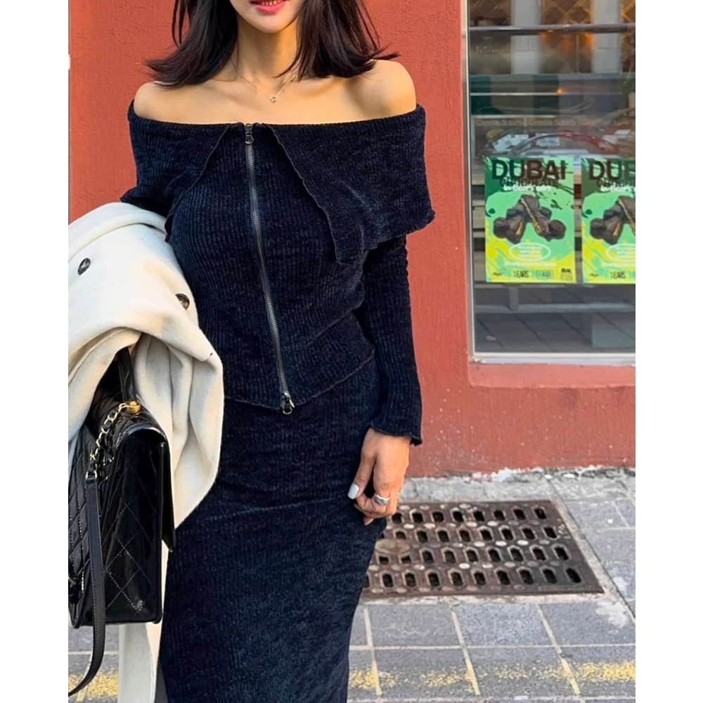 《HSS 韓國代購》正韓 🇰🇷 東大門 露肩針織拉鍊翻領上衣/針織坑條長裙