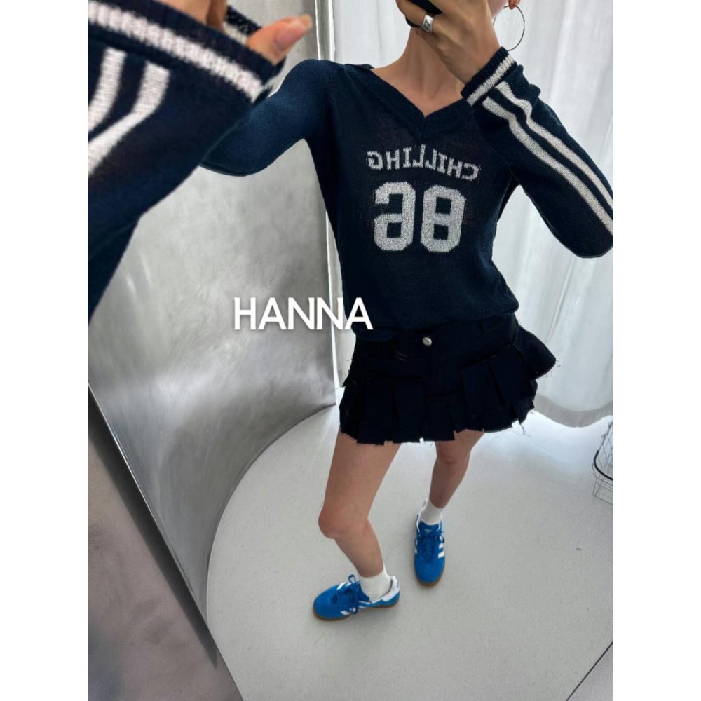 《HSS 韓國代購》正韓 🇰🇷 東大門 V領古著風數字線條復古運動針織衫/不收邊造形高腰百褶裙(安全褲)