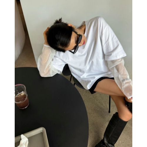 《HSS 韓國代購》正韓 🇰🇷 東大門 MayMay款假2件網狀袖透視感造型純色長版T恤