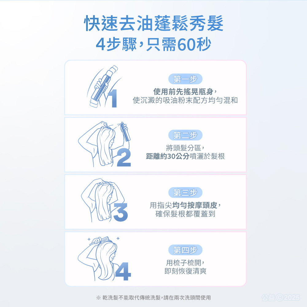 • 減少刺激源,粉末減量,不悶頭皮