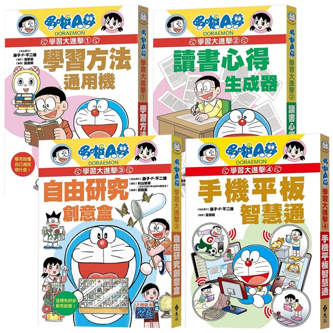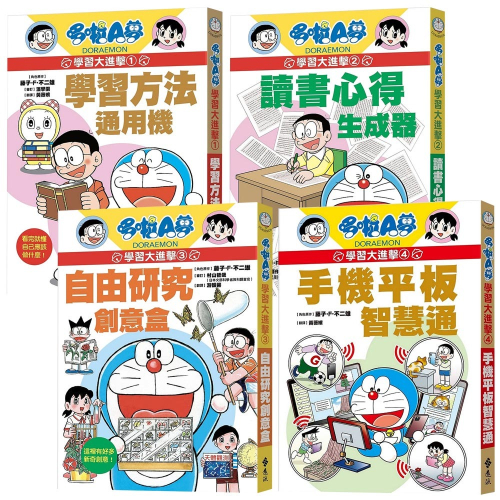 【哆啦A夢學習大進擊】系列以藤子工作室新創作的連環漫畫為主軸,透過大家熟悉的哆啦A夢,陪伴孩子自學力大躍進!從專注力與學習方法養成、孩子最頭痛的讀書心得寫作到自訂主題做研究,這些讓孩子很困擾、家長又不知道怎麼教的類科,種種問題就請哆啦A夢來幫幫忙吧!