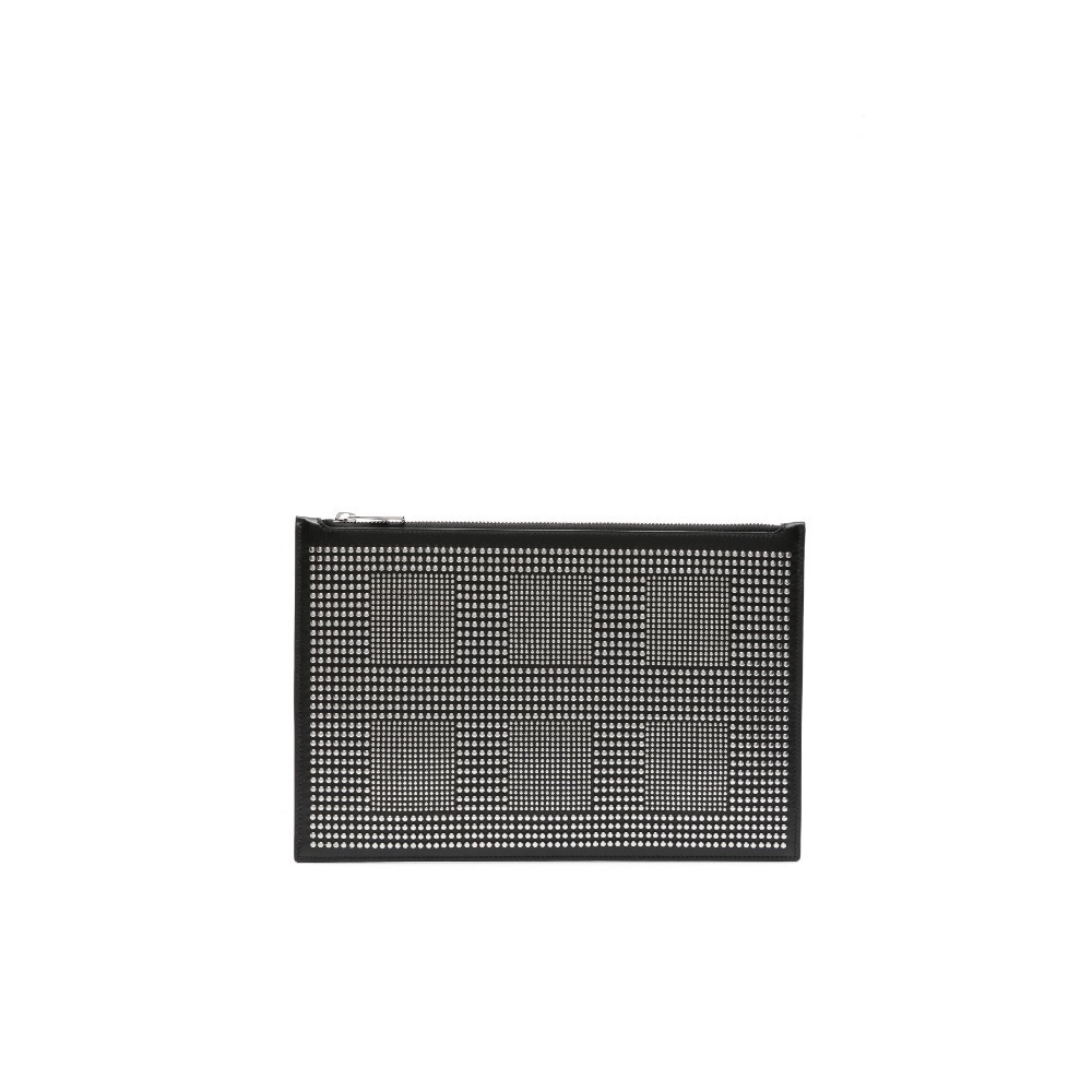黑色,小牛皮,光滑粒紋,銀色鉚訂細節,矩形,頂置拉鏈,內置卡槽,內置插袋,凹面壓花內置logo,皮革襯里,這款商品隨附防塵袋。