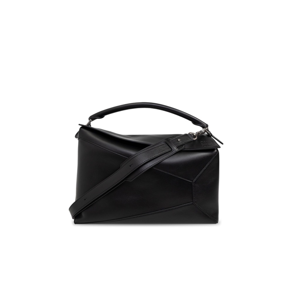 黑色 小牛皮 光滑粒紋 幾何拼接設計 正面飾有logo壓花 一個平頂手柄 可調可拆卸肩帶 頂部翻蓋 頂置隱藏式拉鍊 正面拉鏈口袋 主夾層 絨面皮襯里